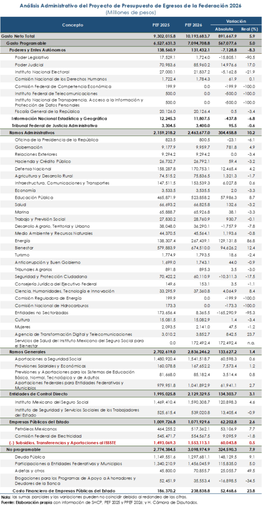 El PEF 2026 refleja un cambio en la orientación del gasto público derivado del inicio de una nueva administración federal, principalmente tras la extinción de órganos. La composición presupuestaria muestra ajustes relevantes en la estructura institucional y funcional del gasto, particularmente en los ramos de defensa, energía y bienestar. Estas modificaciones responden a la redefinición de prioridades gubernamentales, con un enfoque centrado en la política social, la centralización administrativa y la consolidación del control operativo en sectores estratégicos. Si bien, dichos cambios implican una reconfiguración del destino de los recursos, también abren la oportunidad de evaluar su eficiencia y sus efectos sobre la equidad y la sostenibilidad fiscal.