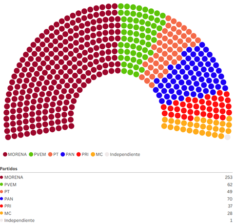 Al comparar los votos a favor del PEF 2026, enviado por el Poder Ejecutivo cuya titular pertenece al partido Movimiento Regeneración Nacional (MORENA), y la composición de la Cámara, se observa que los partidos afines al Ejecutivo —MORENA, PVEM y PT— votan a favor, mientras que la oposición —PAN, PRI y MC— lo hace en contra. En la Figura 1 se muestran los votos emitidos respecto al PEF 2026, mientras que en la Figura 2 se presenta la composición de la Cámara por partido político. Esto muestra que la aprobación del presupuesto no necesariamente responde a un análisis técnico y sustantivo, sino que se determina principalmente por criterios de afinidad política.