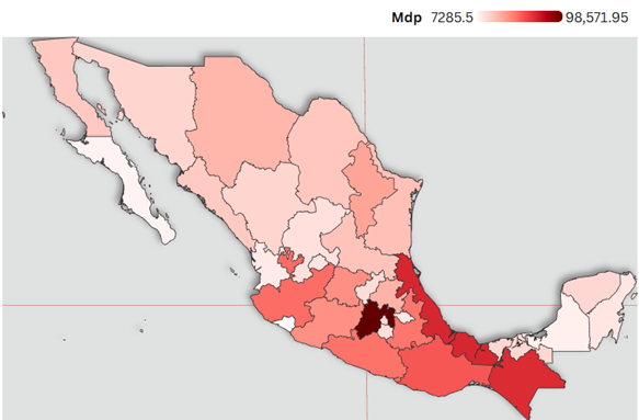 Nota: Las entidades federativas que presentan un tono rojo más intenso son aquellas que concentran una mayor cantidad de recursos.