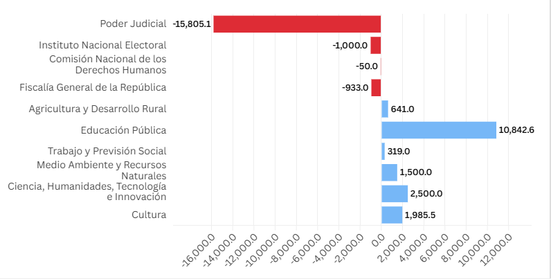 En contraste, entre los ramos que registraron ampliaciones destaca el Ramo 11 “Educación Pública”, con un incremento de 10 mil 842.6 mdp, seguido del Ramo 38 “Ciencia, Humanidades, Tecnología e Innovación”, que recibió 2 mil 500.0 mdp adicionales respecto a lo propuesto en el Proyecto de PEF. Asimismo, los Ramos 16 “Medio Ambiente y Recursos Naturales” y 48 “Cultura” concentraron en conjunto ampliaciones por 3 mil 485.5 mdp.