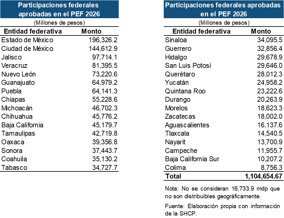 Para el ejercicio fiscal de 2026 se estima transferir un billón 456 mil 45.9 millones de pesos por concepto de participaciones federales, de los cuales 16 mil 733.9 millones de pesos no están identificados geográficamente hasta el momento. Cabe señalar que gran parte de estos recursos puede variar durante el ejercicio presupuestal, ya que al inicio se estiman con base en la recaudación prevista, pero mes a mes se distribuyen conforme a lo efectivamente recaudado. Por lo tanto, si se presenta una mayor recaudación, se otorgan más recursos; en cambio, si esta disminuye, los montos transferidos también se reducen.